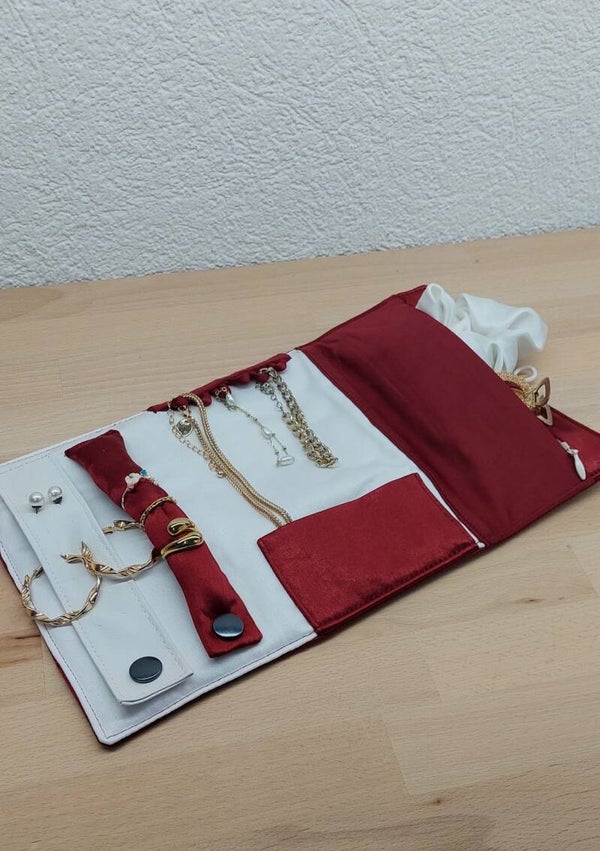 Jolie pochette à bijoux pratique pour vos déplacements. Permet un rangement efficace pour toutes sortes d'accesoires.